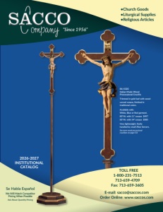 We Will Match Competitor Pricing When Possible Se Habla Español E-mail: sacco@saccos.com Order Online: www.saccos.com TOLL FREE 1-800-231-7513 713-659-4709 Fax: 713-659-3605 •Church Goods •Liturgical Supplies •Religious Articles 2026-2027 INSTITUTIONAL CATALOG “Since 1956” 86-4320 Italian Made Wood Processional Crucifix Trimmed in gold leaf with wood carved corpus, finished in traditional colors. Available with: White, Blue or Red garment. 80"Ht. with 11" corpus $497 85"Ht. with 14" corpus $585 Very lightweight. Easily handled by small Altar Servers. See more wood processional crucifixes on page F23 Ask About Quantity Pricing SACCO COMPANY
